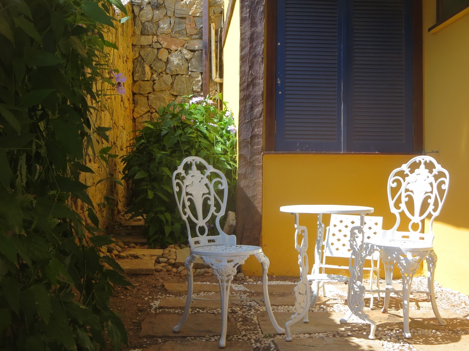 A year ago I was thrilling to the plethora of dining areas we have at home — five, count them, five, quite separate and distinct, each one of them used depending on the meal, the weather, and the number of people we need to seat. Well, could it be that five wasn't enough? We have added a sixth dining area to the mix. Outside the living room, and at the top of the stairs which lead to the beach, our new favorite dining area is intimate, cozy, protected from the glare of the setting sun, and it reminds us of Provence: